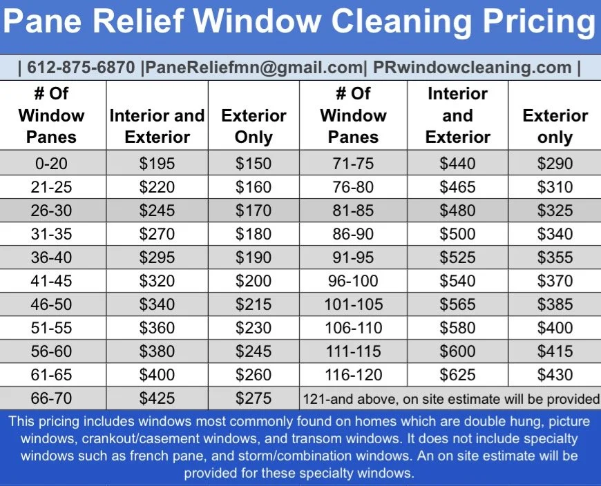 Our pricing is simple. Use the guide to determine the cost for the number of window panes you have. For specialty windows like take apart storms and fixed grid french pane a free on site estimate will be provided.